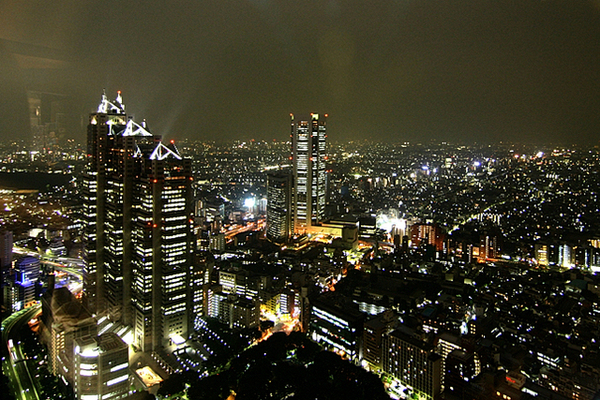 出了飯店門口已經是晚上八點半, 照著抓來的新宿地圖往東京都廳的方向前去, 往西邊走, 經過小田急百貨, 然後延著中央通直走, 過不一會兒便看見東京都廳的南北兩棟建築, 都廳也是許多日劇裡會出現的場景, 都廳有南北兩個展望室, 我們去的是北邊的展望室, 進入的時候比需檢查隨身行李. 進入展望室後, 除了四面的落地窗可觀賞東京夜景之外, 展望室並且有賣許多小飾品, 還有一間鋼琴酒吧.